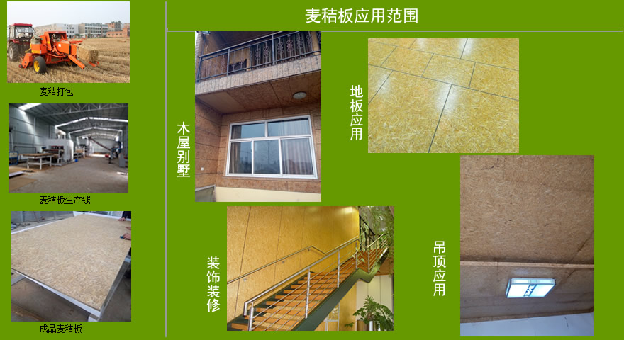 秸桿板材具有強(qiáng)度高、產(chǎn)品幅面大、防火、防水、綠色環(huán)保、成本低廉等特點(diǎn)。產(chǎn)品花色品種繁多,有上百種,產(chǎn)品能釘、鋸、刨、粘,具有與木質(zhì)板完全相同的應(yīng)用與加工特性。廣泛用于商場、賓館、酒家、夜總會(huì)、車站、辦公樓、居室的墻壁、門窗、墻裙、吊頂?shù)仁覂?nèi)裝飾,在高檔家具、房門、隔間方面也用途廣泛。